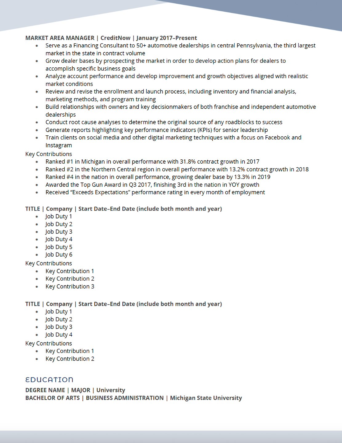 This is a modern template, which is generally best for creative, innovative, or forward‑looking industries where design and visual impact matter, such as Marketing & Advertising, Graphic Design, Web Design & UX/UI, Social Media & Digital Content Creation, Fashion & Beauty, and Entertainment & Media. This is a non-exhaustive list, and you should feel free to choose a template style that feels right to you, your industry, and your role.