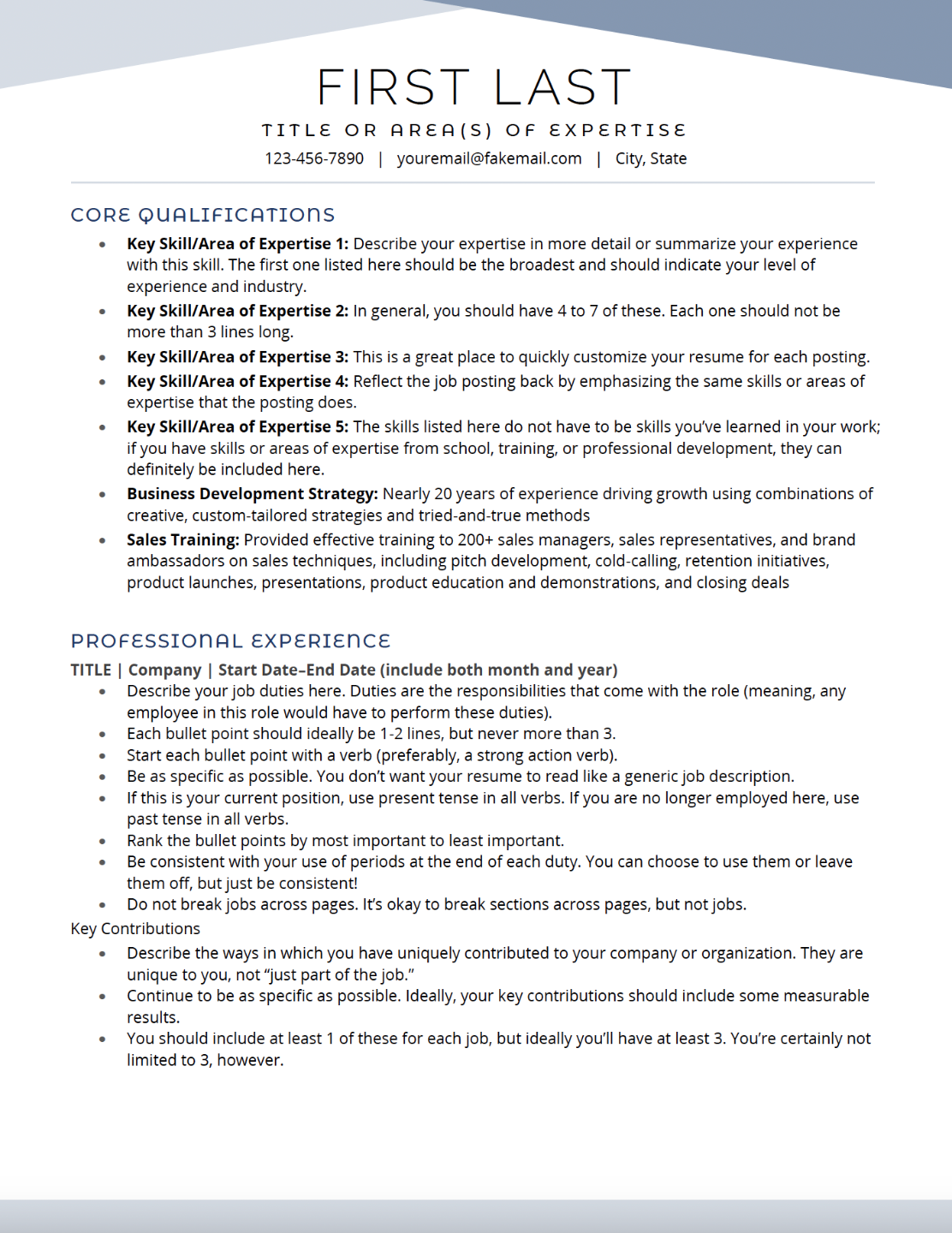 Launch the template in Word. Delete any sections that don’t apply to you, then copy and paste the content you drafted in the Unformatted Template in Lessons 6-14 of How to Write a Job-Landing Resume. - Format