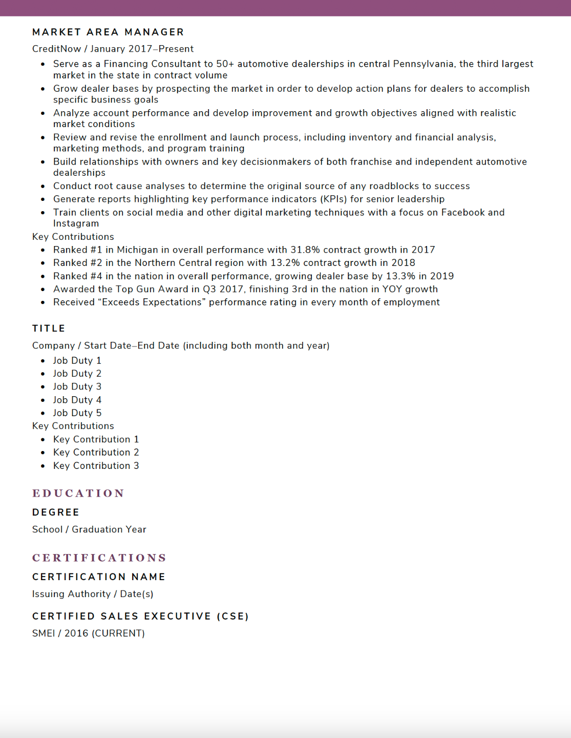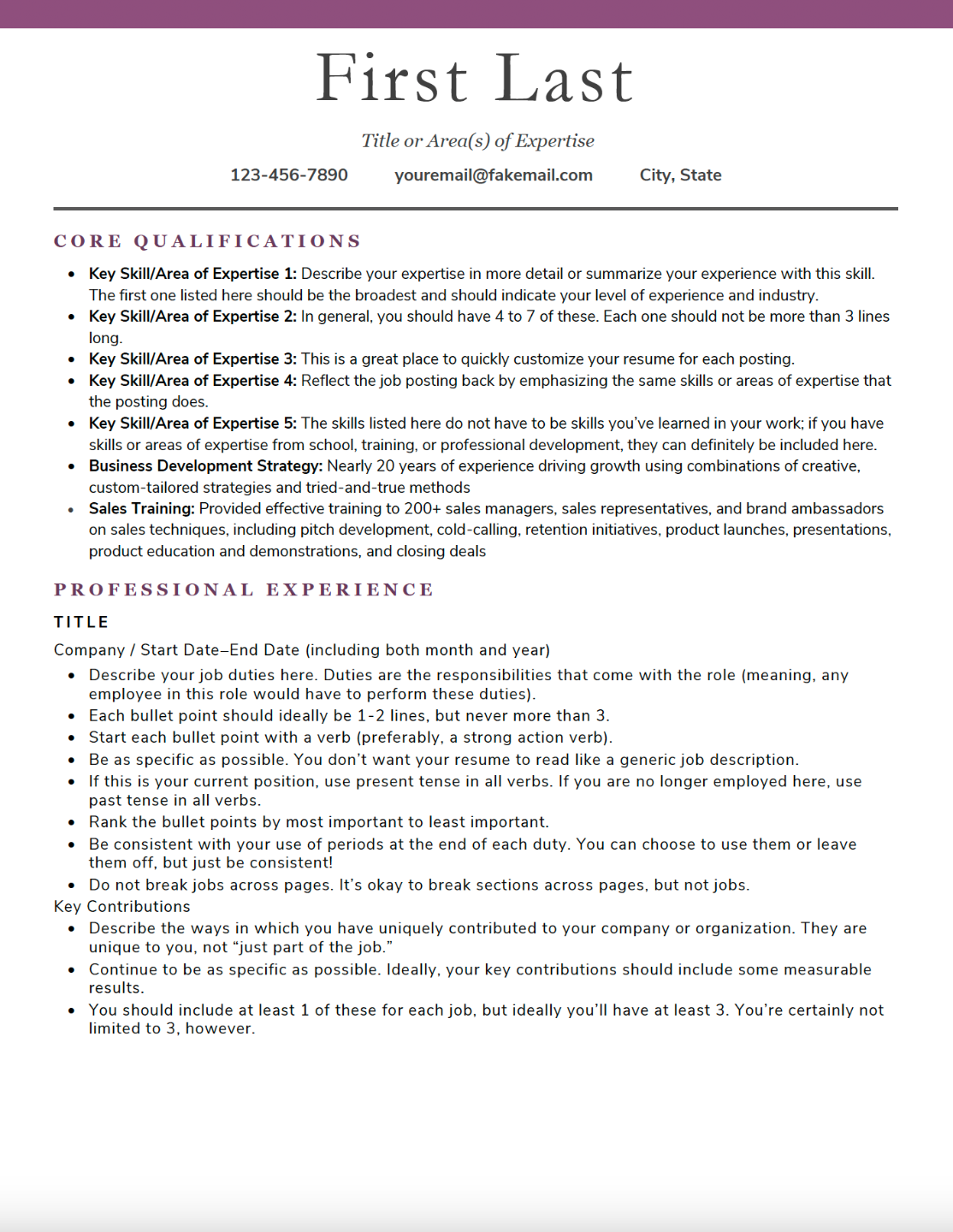 Launch the template in Word. Delete any sections that don’t apply to you, then copy and paste the content you drafted in the Unformatted Template in Lessons 6-14 of How to Write a Job-Landing Resume. - Format
