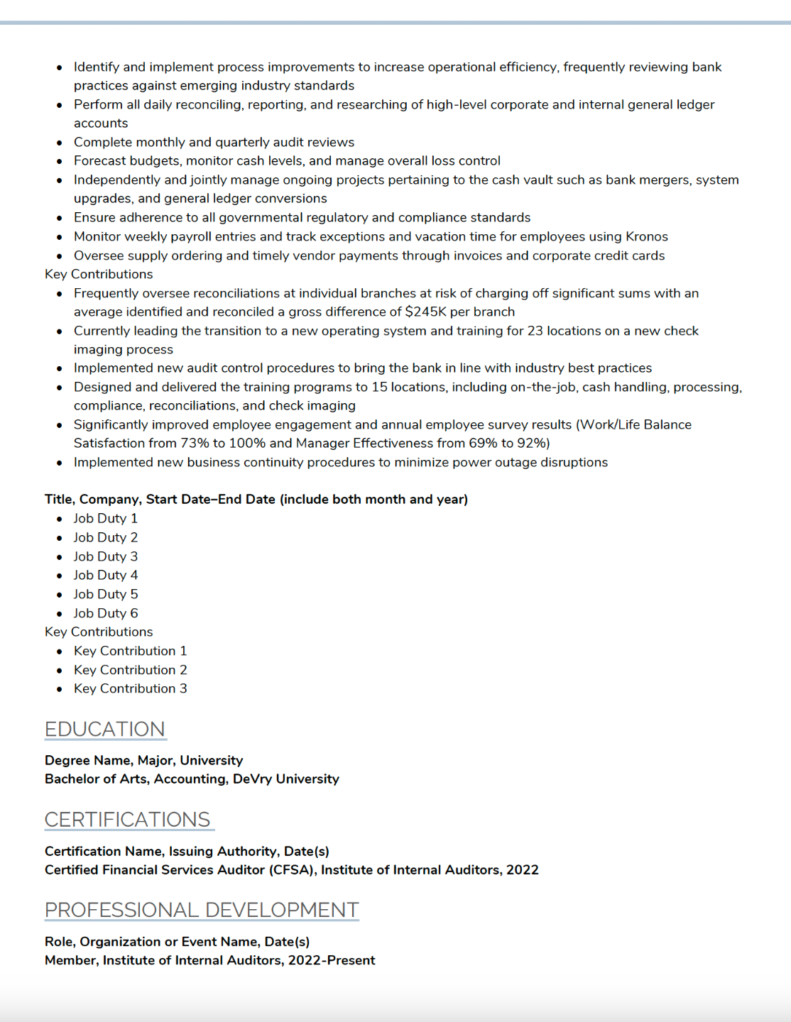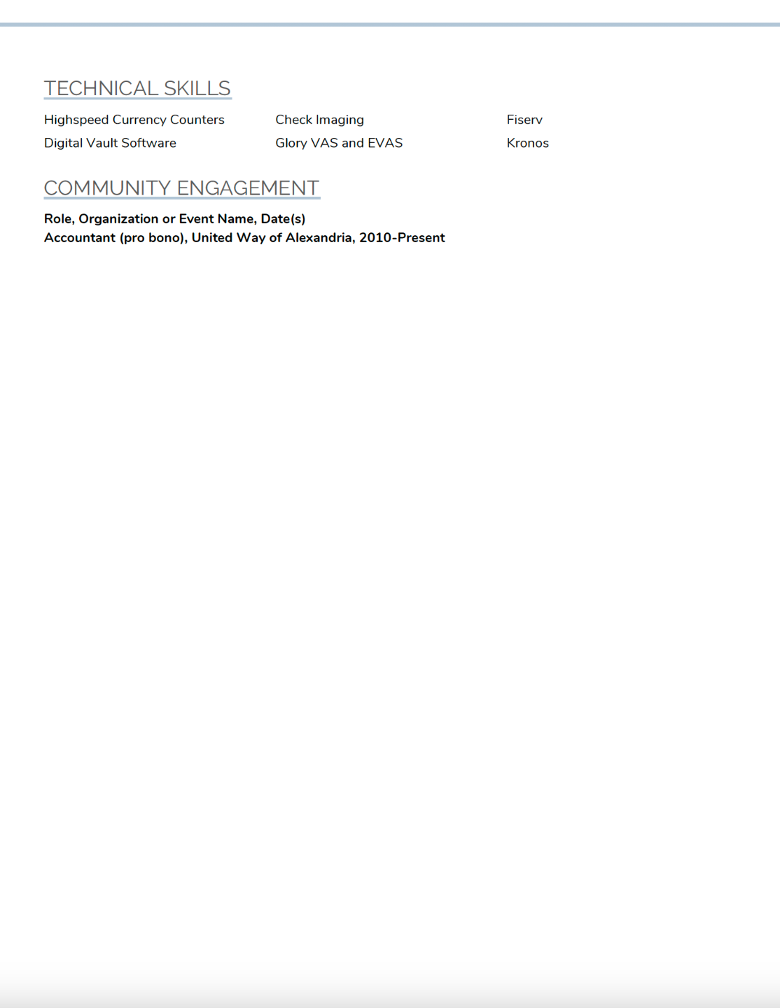 This is a simple template, which is generally most appropriate for straightforward, no‑frills presentation where clarity and ATS compliance matter most. For example: IT, Engineering, Manufacturing, Skilled Trades (electricians, plumbers, carpenters, etc.), Logistics & Warehousing, Transportation (truck drivers, delivery services, etc.), Customer Service, Retail, and Healthcare Support Roles (medical assistants, nursing aides, etc.). This is a non-exhaustive list, and you should feel free to choose a template style that feels right to you, your industry, and your role.