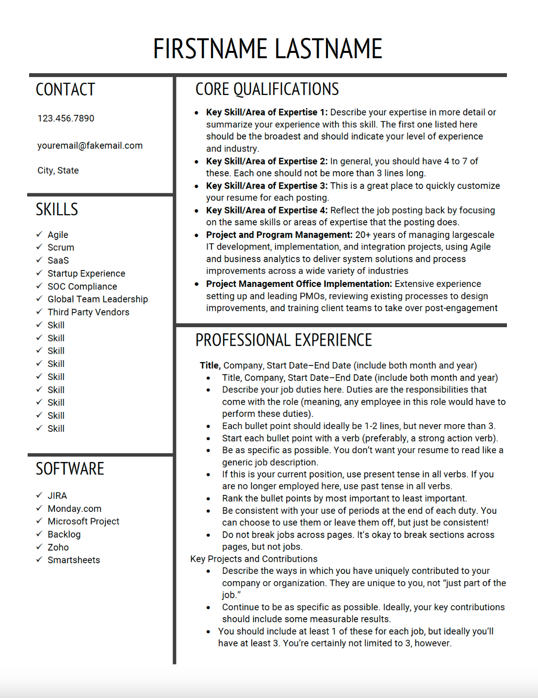 Launch the template in Word. Delete any sections that don’t apply to you, then copy and paste the content you drafted in the Unformatted Template in Lessons 6-14 of How to Write a Job-Landing Resume. - Format