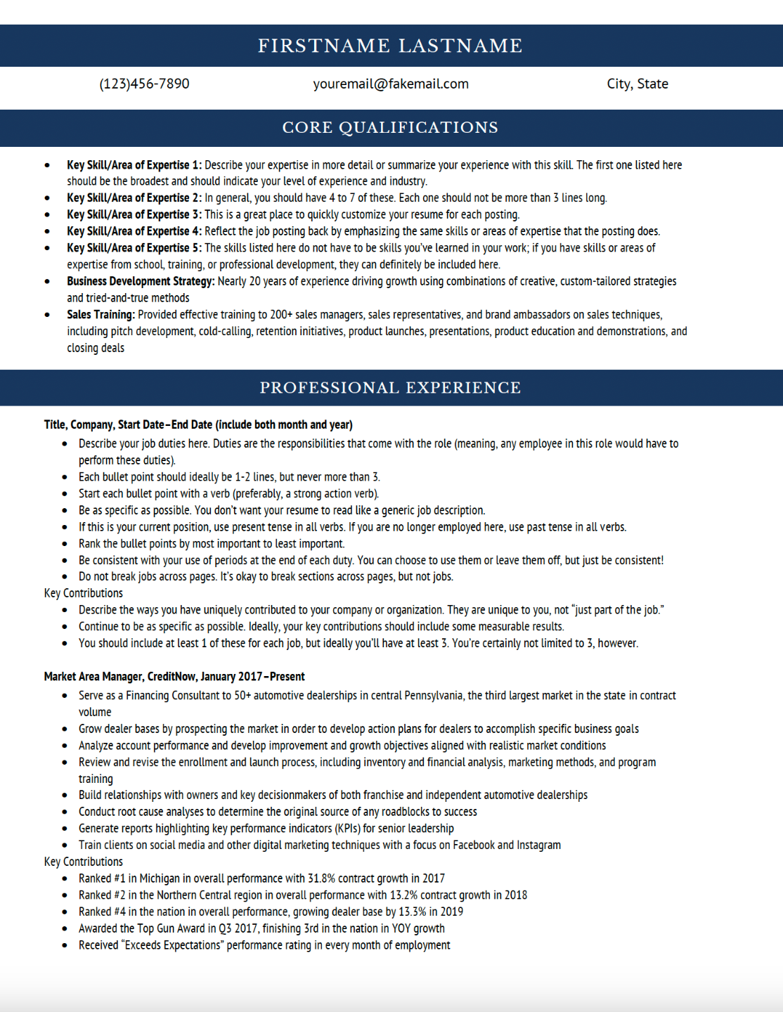 Launch the template in Word. Delete any sections that don’t apply to you, then copy and paste the content you drafted in the Unformatted Template in Lessons 6-14 of How to Write a Job-Landing Resume. - Format