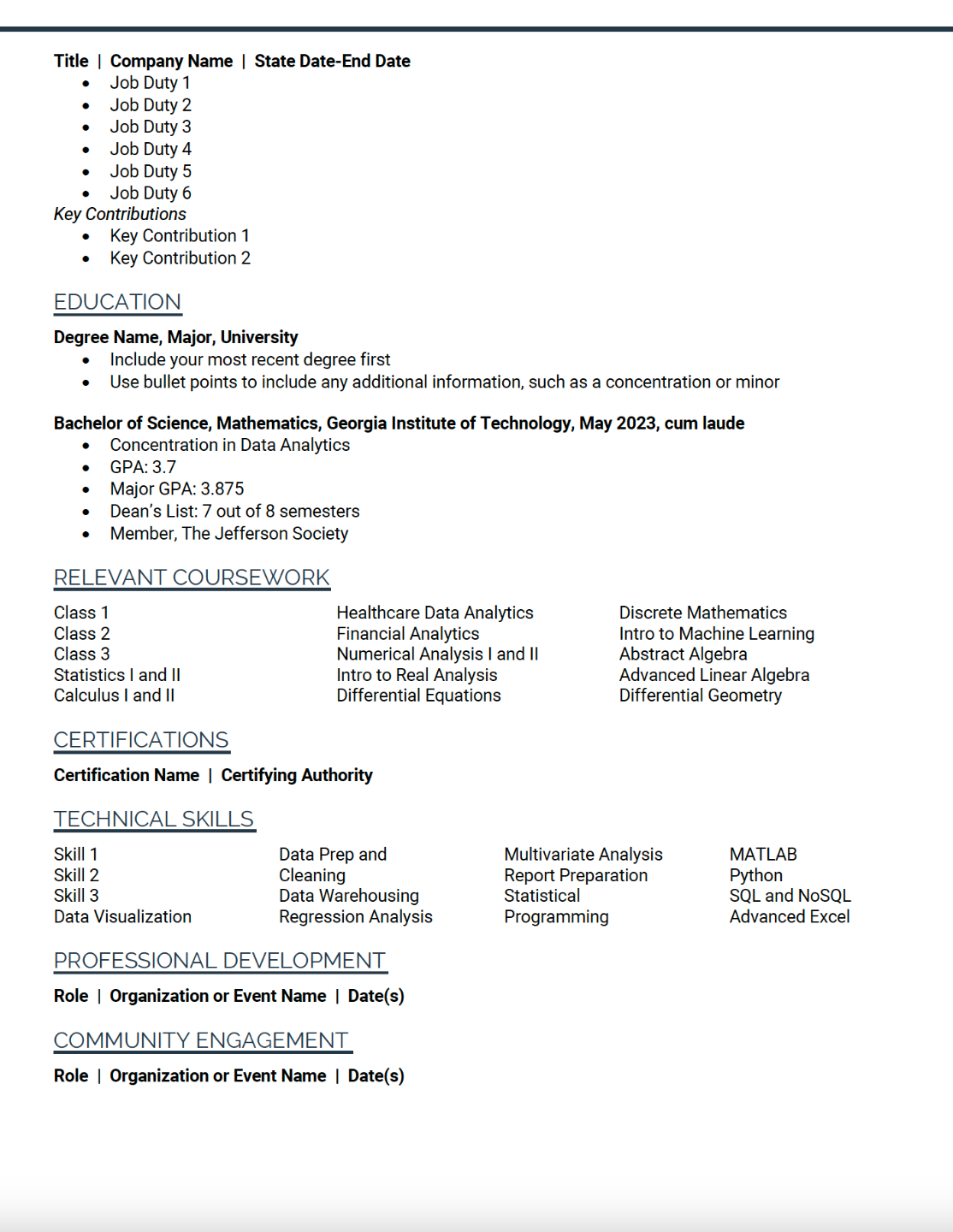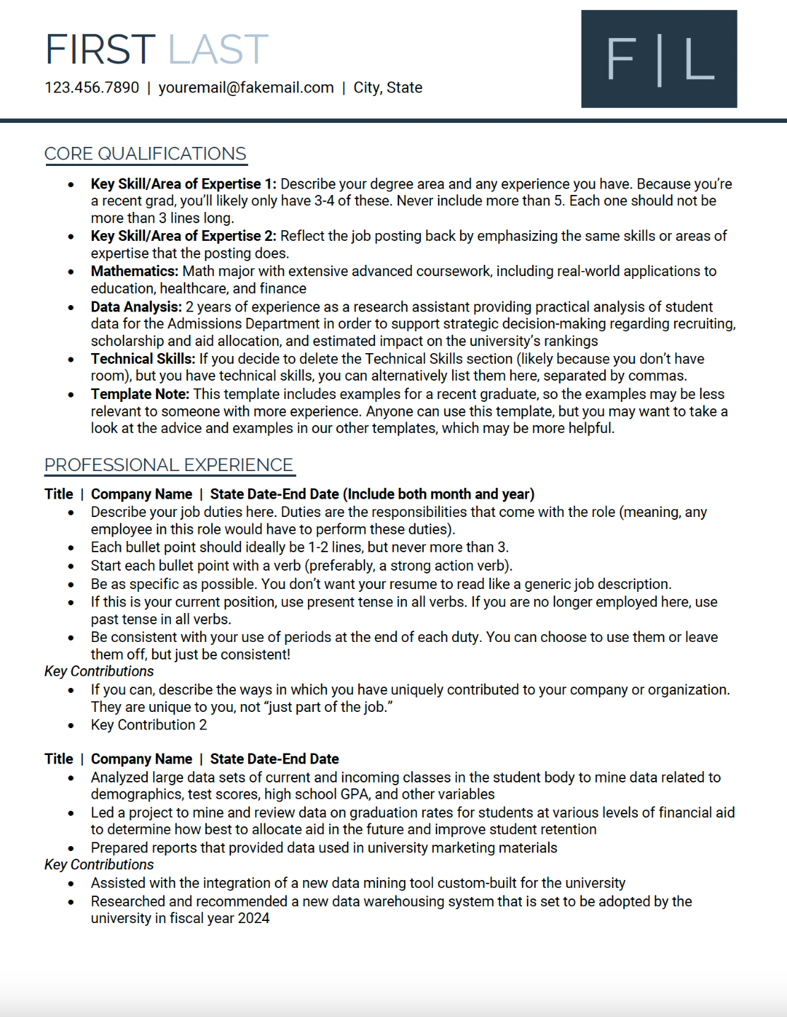 Launch the template in Word. Delete any sections that don’t apply to you, then copy and paste the content you drafted in the Unformatted Template in Lessons 6-14 of How to Write a Job-Landing Resume. - Format