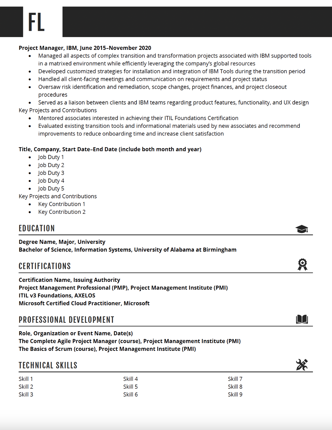 Launch the template in Word. Delete any sections that don’t apply to you, then copy and paste the content you drafted in the Unformatted Template in Lessons 6-14 of How to Write a Job-Landing Resume. - Format